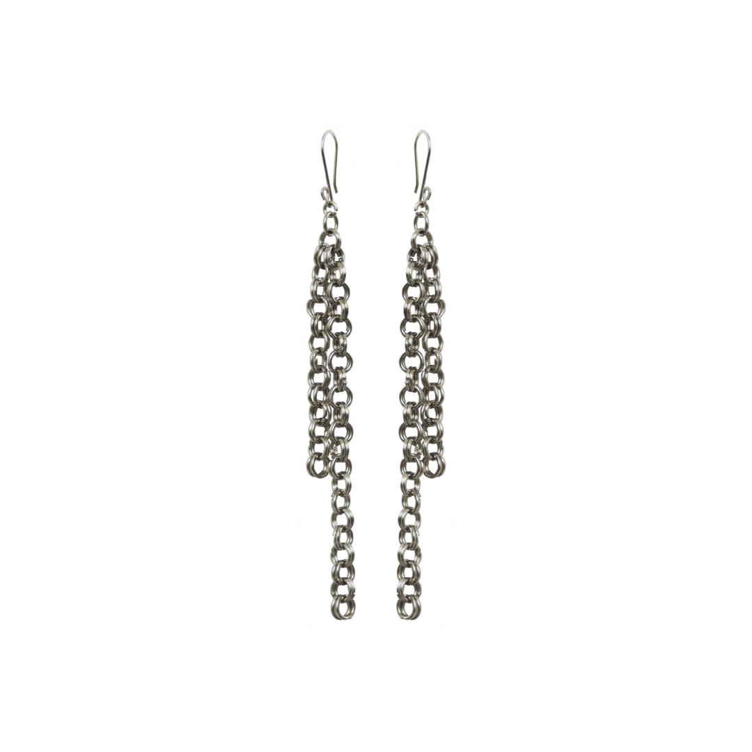 Como una cascada de eslabones impregnados de rebeldía y juventud, estos aretes artesanales reciben el nombre de la madrina del punk: Patti Smith.