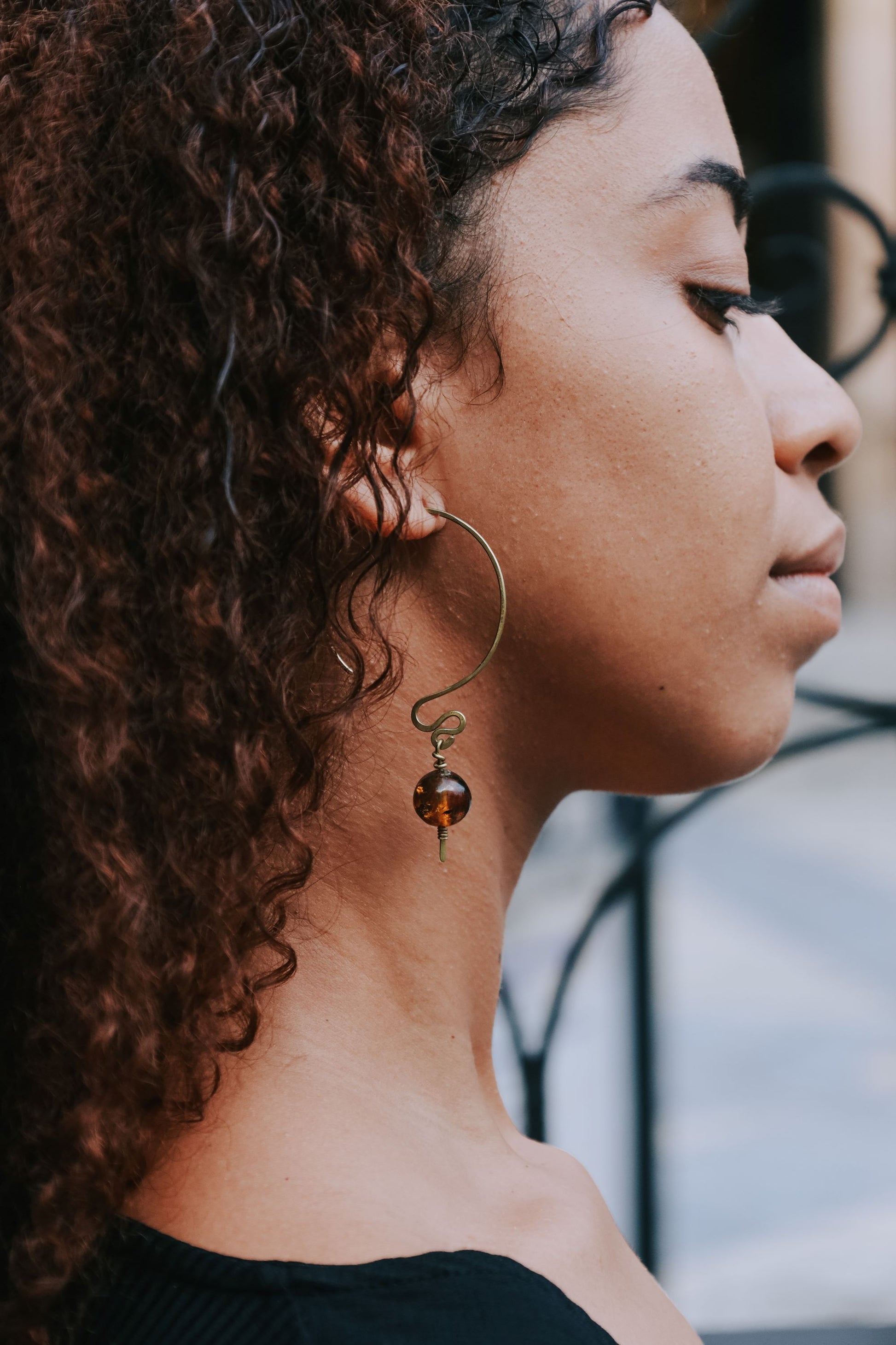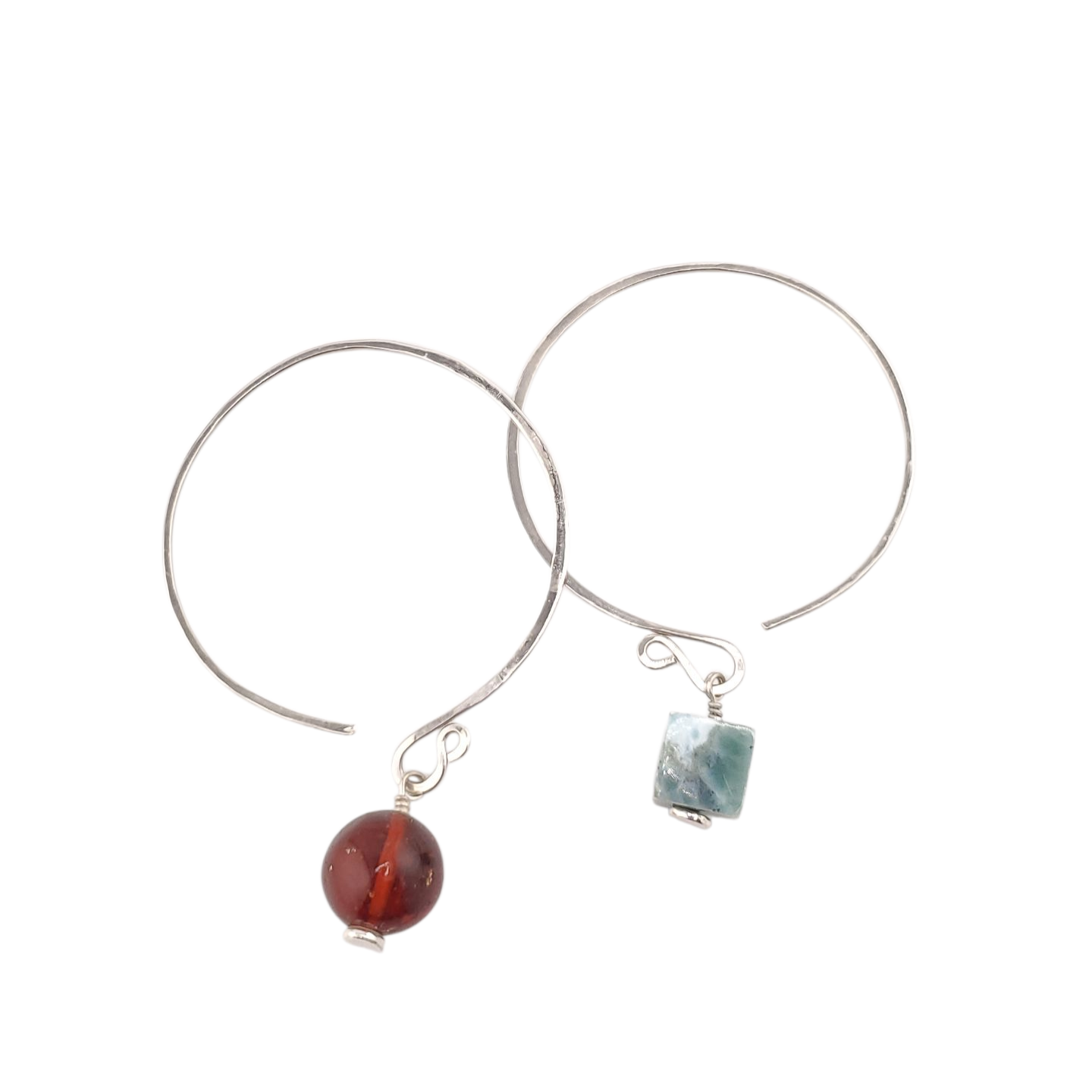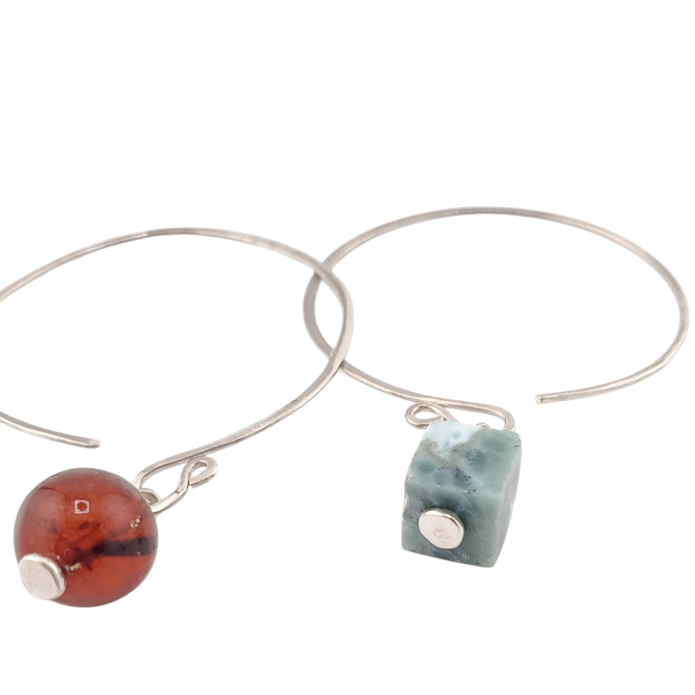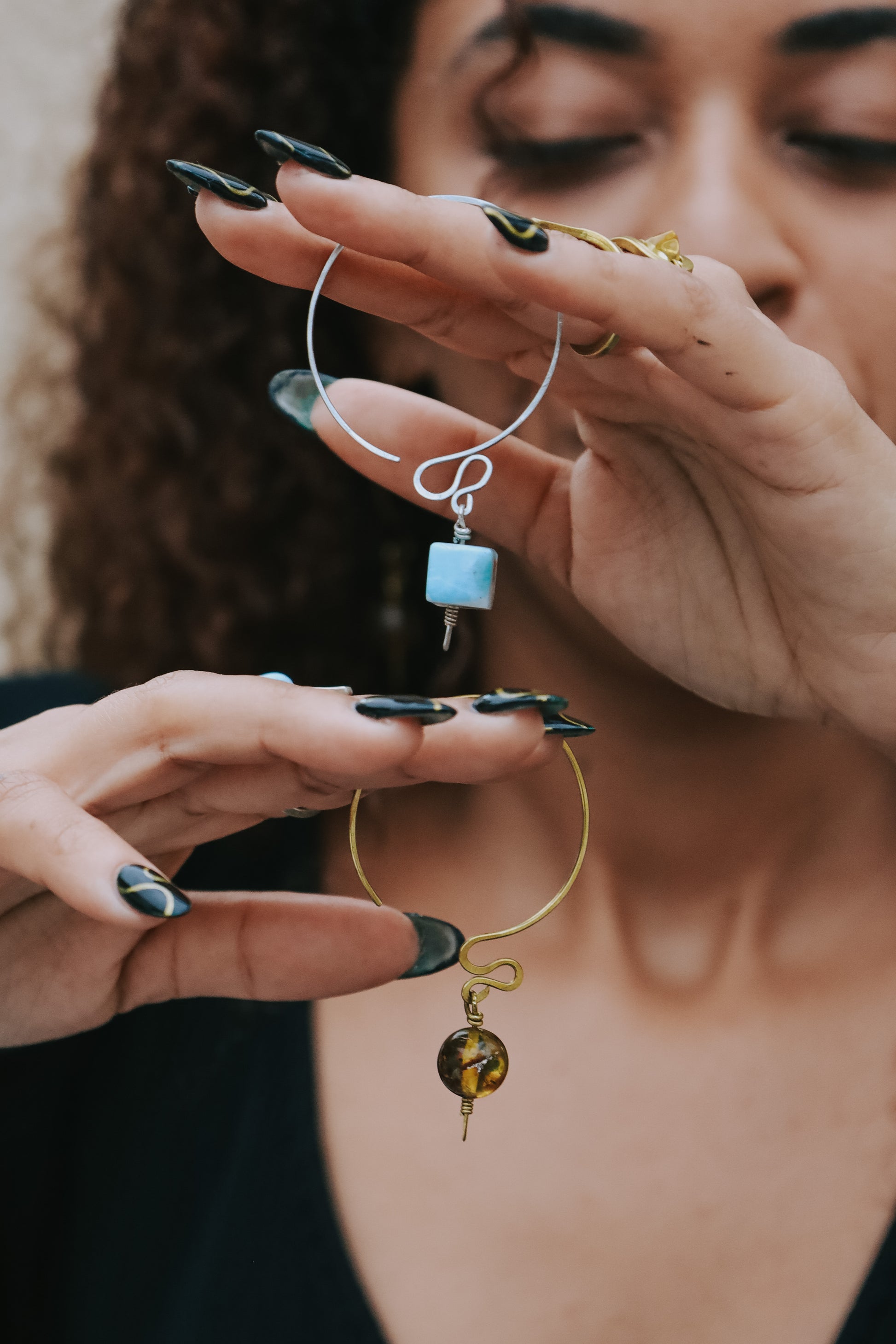 Los -aretes- aros Tierra y Mar son una expresión perfecta de la armonía entre dos elementos fundamentales para la vida natural: el ámbar te envolverá en la calidez y energía terrenal y el larimar te transportará a las profundidades serenas del océano.